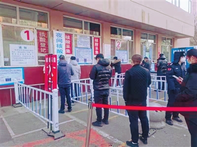 春節(jié)期間大家走親訪友,加上寒假學(xué)生返沈離沈等因素,使得人員流動大大增加。為了方便百姓做核酸檢測,沈陽市紅十字會醫(yī)院積極響應(yīng)沈陽市疫情防控工作要求,開展了24小時核酸檢測工作,并增加至兩個采集窗口。沈陽晚報、沈報全媒體記者在沈陽市紅十字會醫(yī)院核酸檢測點看到,兩個采樣窗口前都排著長隊,在工作人員的引導(dǎo)下,核酸采樣正在有條不紊地進行著。